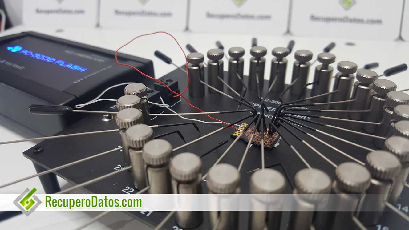 Last year in Prague, we acquired a revolutionary tool in which is not required a welded device to recover data, because it is done by contact. It is designed to make a connection between the different pins the Monolothics Flash Cards have, as its shown in the image below.